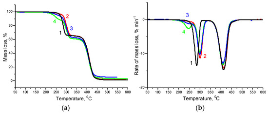 TG (a) and DTG (b) curves for the PHBV/PCL(1:2) mixture (1); PHBV/PCL(1:2)/CNC(PVP)–5 (2), PHBV/PCL(1:2)/CNC(PVP)–10 (3), and PHBV/PCL(1:2)/CNC(PVP)–15 (4) composites.