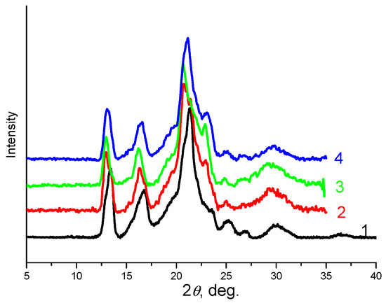 X-ray diffraction patterns of the PHBV/PCL(1:1) mixture (1); PHBV/PCL(1:1)/CNC(PVP)–5 (2), PHBV/PCL(1:1)/CNC(PVP)–10 (3), and PHBV/PCL(1:1)/CNC(PVP)–15 (4) composites.