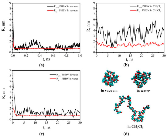 In DCM, the average values of the end-to-end distance and radius of gyration of the PHBV are, respectively, <Re-t-e> = 3.49 ± 1.05 nm, <Rg> = 1.35 ± 0.25 nm, and in vacuum <Re-t-e> = 1.01 ± 0.43 nm, <Rg> = 0.69 ± 0.04 nm (Figure 15). In water, the average values are <Re-t-e> = 1.24 ± 0.40 nm, <Rg> = 0.68 ± 0.03 nm.