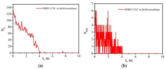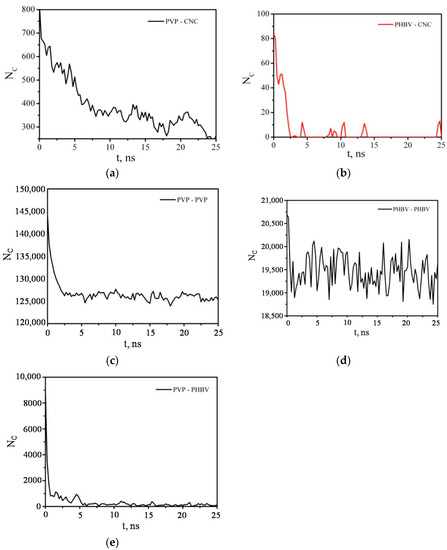 The time dependence of the number of close contacts between any pair of CNC–polymer, polymer–polymer, CNC–DCM, polymer–DCM atoms confirms the previously observed behavior of the composite in the solvent. The solvent molecules tend to penetrate the interior of the composite. The high affinity of PCL, PHBV, and PVP with the solvent promotes the dissolution of the composite. This is evidenced by an increase in the number of close contacts between the components of the system and the solvent (Figure 27b) and a decrease in the number of close contacts in polymer–polymer and CNC–polymer pairs (Figure 27a).