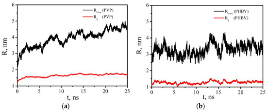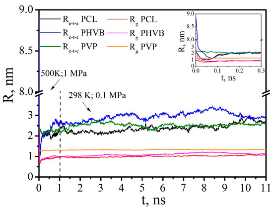 The time dependence of the end-to-end distance and radius of gyration for PCL, PHVB, and PVP.
