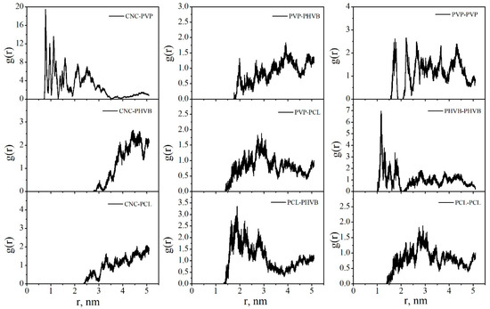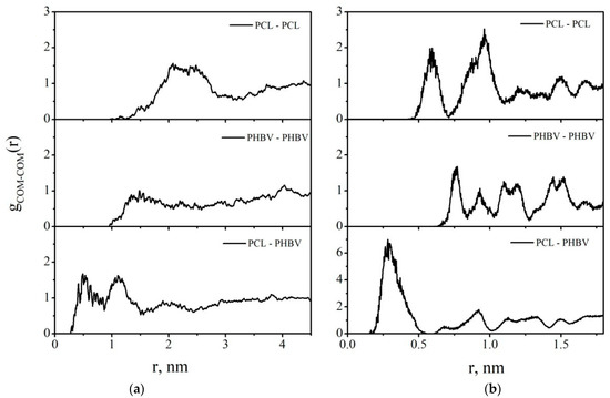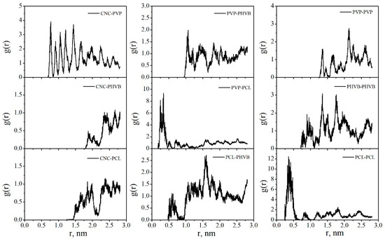 Figure 28 shows the radial distribution functions (RDFs) between the centers of mass of the composite components in vacuum. The maxima on the RDF curves for the PCL–PCL and PVP–PCL pairs are in the range of 0 to 0.5 nm. Comparing the RDFs for the pairs PHBV–PHBV and PCL–PCL, we can say that PCL macromolecules in the composite have a denser packing. This suggests that, compared with PHBV, PCL has a closer contact with PVP. In DCM, all the peaks on the RDFs shift towards larger distances, indicating the desorption process and the movement of the polymer macromolecules into the solution bulk (Figure 29).