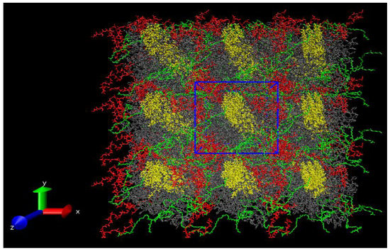 Snapshot of the final configuration of the PHVB/PCL/PVP/CNC composite with periodic images: PVP is colored in grey; CNC is colored in yellow; PHBV is colored in red; PCL is colored in green.