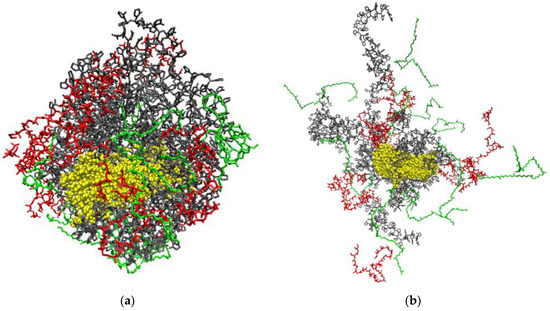 Snapshot of the initial (a) and final (b) configuration of the PHVB/PCL/PVP/CNC composite in DCM: PVP is colored grey; CNC is colored yellow; PHBV is colored red; PCL is colored green. DCM molecules are not depicted for clarity.