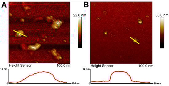 Magnetic iron oxide nanoparticles were synthesized using the chemical co-precipitation method and characterized for their colloidal variability and possible effects on resulting nanotopography. The prepared MNPs were coated with citrate ions to stabilize the particles in the dispersion []. The choice of citrate ions for MNPs coating was justified by their minimal effect on the size of the obtained nanoparticles and prevention of nanoparticle aggregation []. The sizes and morphology of magnetic nanoparticles were investigated using atomic force microscopy. AFM imaging allowed visualization of an aggregate of unstabilized MNPs as well as citrate-stabilized magnetic nanoparticles with irregular spherical morphology (Figure 1A,B). AFM scans showed that the diameter of the citrate-stabilized particles varied from 14 to 40 nm, which is in good agreement with the sizes of nanoparticles most used for surface modification []. The sizes of nanoparticles were additionally assessed using transmission electron microscopy (Supplementary Figure S1), which showed the average size of MNPs to be about 10 nm.