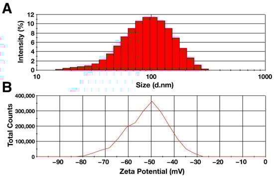The hydrodynamic diameter and zeta potential of the particles were determined using the dynamic light scattering method. The data obtained are shown in Figure 2. According to the data obtained, the hydrodynamic diameter of the synthesized citrate-stabilized magnetic nanoparticles had a distribution with negative symmetry. The average particle diameter was 80.5 ± 0.9, with the peak located in the range of 90–100 nm (Figure 2A). The zeta potential of the MNP aqueous solution was −50.4 ± 1.3 mV, indicating high colloidal stability of the solution (Figure 2B) []. The polydispersity index was 0.20 ± 0.01, which indicates the homogeneity of the suspension under study []. The differences in the sizes obtained with AFM and DLS were due to the difference in the counting method and the conditions in which the measurements take place. One of the factors is the presence of a hydration shell in the case of the DLS method, which can strongly influence the result []. In addition, the shape of the particles and the degree of homogeneity of the solution may affect the hydrodynamic diameter [,].