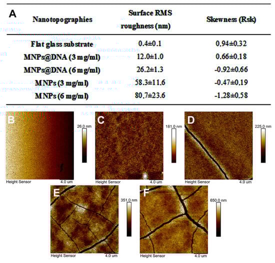 (A) Surface RMS roughness and their asymmetry coefficient obtained with AFM. AFM surface topography: (B) glass, (C) MNPs@DNA 3 mg/mL, (D) MNPs@DNA 6 mg/mL, (E) MNPs 3 mg/mL, (F) MNPs 6 mg/mL.