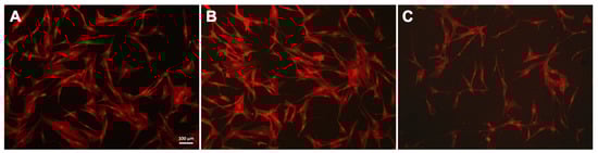 Fluorescent images of hTERT-transduced MSCs with stained cytoskeleton: (A) glass, (B) MNPs@DNA 3 mg/mL and (C) MNPs@DNA 6 mg/mL. F-actin stained with phalloidin (red).