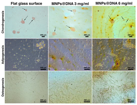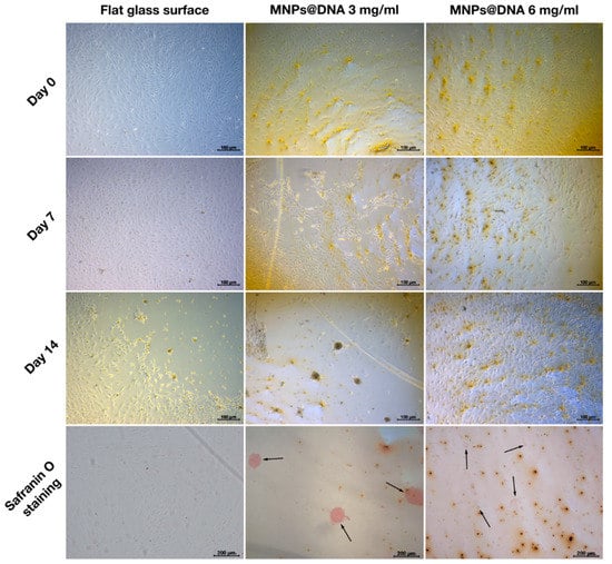 Chondrogenic differentiation of hMSCs on surfaces coated with a solution of 3 and 6 mg/mL of magnetic nanoparticles with DNA (50 µg/mL). The chondrocytes were stained with safranin O. The arrows show the aggregates of chondrocytes.