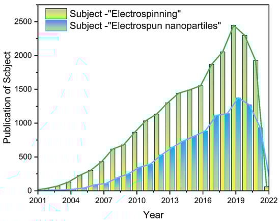 Nanofiber membranes are prepared by the ES process of polymers, and the application scenario is constrained to fiber scaffolds [51,52,53]. Researchers are not satisfied with this single role, so various functional nanofiber membranes have been prepared by ES in combination with multifunctional materials, among which NNHs show great potential to combine the advantages of nanoparticles with the properties of polymers. Additionally, the is a wide range of application scenarios [51,52,53,54,55,56,57,58]. Of interest is that as with decades of research, the number of electrospun nanoparticle articles published occupies half the number of electrostatic spinning (Figure 2). It shows the pivotal position of NNHs.