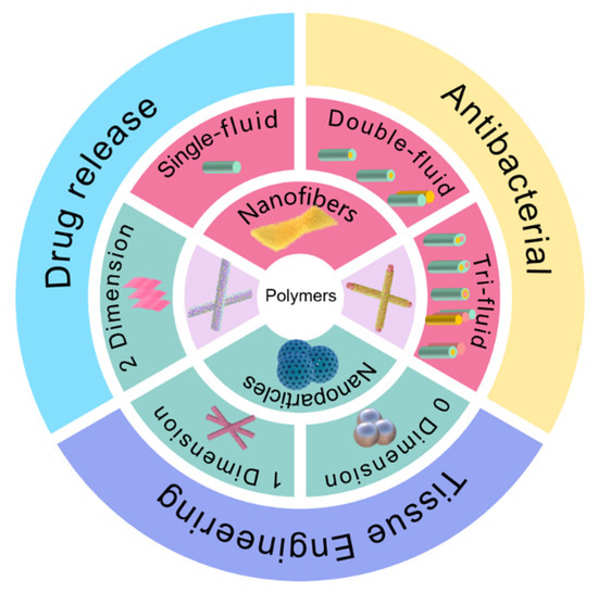 NNHs prepared by combining the characteristics of biocompatible polymers and multifunctional nanoparticles are already practical in medical applications [75,76]. The objective of this review is to investigate the preparation of nanofiber and nanoparticle hybrids in-depth by combining different processes with ES; concentrate on the most recent breakthroughs of NNHs in the medical area (Figure 3); and provide clear concepts for research workers in material preparation and application.
