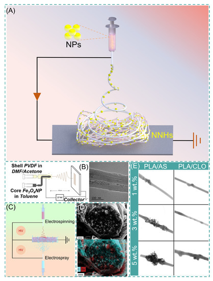 The polymer solution and NPs are divided into different syringes to eliminate the agglomeration of NPs inside the fibers, which are encapsulated in the fibers by coaxial electrospinning or electrospray. Navarro Oliva and co-workers prepared core-shell-structured NNHs by the coaxial electrostatic spinning technique using an Fe3O4 solution as the core layer and a PVDF polymer solution as the shell layer. As shown in Figure 4B, TEM images showed that the NPs were uniformly dispersed inside the fibers without agglomeration [84]. Combining both electrospinning and electrospraying to prepare NNHs is also a convenient method. These two processes are carried out simultaneously, and NPs can be uniformly distributed in the fiber layer (Figure 4C).