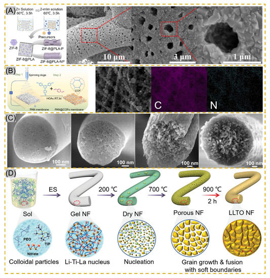 (A) Schematic of in situ ZIF-8 growth on PLA fibers and Scanning Electron Microscopy (STEM) images of ZIF@PLA-P, reprinted with permission from Ref. [95]. Copyright 2021 ACS Publications. (B) Schematic of PAN@COF synthesis and EDS mapping images reprinted with permission from Ref. [91]. Copyright 2022 Elsevier. (C) Transmission Electron Microscopy images of MBNM films prepared based on different contents of PAA, reprinted with permission from Ref. [96]. Copyright 2021 Elsevier. (D) Schematic of LLTO NF process prepared by electrospinning followed by calcination, reprinted with permission from Ref. [97]. Copyright 2021 John Wiley and Sons.