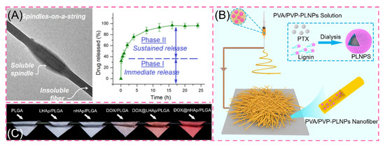 Facing the complex living system of organisms, hydrophobic drugs confront barriers in the delivery pathway. The use of NPs as carriers can improve the solubility of hydrophobic drugs. Simultaneously, the Enhanced Permeability and Retention (EPR) effect of NPs can stabilize tumor aggregation [115]. These benefits steadily improve the use and efficacy of hydrophobic drugs [117]. Recently, Xu et al. prepared CUR/CUR@MSNs-NFs by ESP by loading curcumin (CUR) in SiO2NPs. The scaffolds exhibited excellent biphasic release, which released 54% in the first 3 days and all in 35 days [118]. In addition, by modifying the SiO2NPs, the amine-functionalized MSNs are hydrophilic and positively charged, resulting in a more prominent anti-cancer effect [119]. Li and co-workers used amphiphilic lignin nanoparticles (LNPs) loaded with the anticancer drug paclitaxel (PLNPs) encapsulated in PVA/PVP nanofibers, which exhibited a 59% initial abrupt release compared to the rapid abrupt release of PLNPs (Figure 6B) [115]. In the same manner, adriamycin DOX was inserted into layered nanohydroxyapatite LHAp (DOX@LHAp) to blend it with PLGA. For obtaining nanofibers, DOX was loaded with 2D layered material. The release showed significant attenuation at the initial stage of release and subsequent strong prolonged release. The in vitro release showed excellent controlled release ability (Figure 6C) [116]. However, the relevant tests are still in the laboratory stage, and the in vivo situation is more complex because there are many influencing factors. Therefore, the in vivo drug release situation needs further research.
