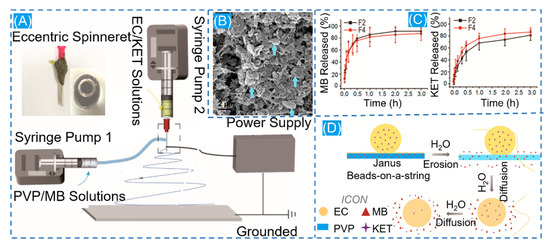Inside the face of this more complicated therapeutic environment, the role of a single drug is considerably limited. To treat this shortcoming, the dual-drug biphasic approach is adopted. The ES process is used to load various drugs onto different materials. In a dual-drug biphasic release, core-shell and Janus composite fibers are frequently employed [120]. The existence of beads on a string in the ESP is frequently unloved, with most people believing that smooth fibers and uniform particles are the desired result. Nevertheless, according to the Janus beaded fibers prepared by Li and co-workers through a homemade eccentric spinning head with a hydrophilic polymer PVP containing the MB model drug and a hydrophobic polymer EC containing ketoprofen (KET) on other side, the beads on a string have more advantages in the drug release phase compared to the prepared Janus nanofibers (Figure 7). The drug is evenly enclosed in the fibers throughout the stretching process, forming a good compartment. Because of the low viscosity of the solution during the stretching phase, the beaded structure generates an unstable jet during electrospinning. This phenomenon causes polymer aggregation to generate discrete bumps. The hydrophilic side of Janus beads releases MB quickly, whereas the hydrophobic side takes longer to release ketoprofen (IPU). This facilitates a dual-drug controlled release [121]. Then, encapsulating a nanoparticle-loaded drug in a nanofiber loaded with another drug may yield pleasantly exciting results in a controlled drug release through the difference of their properties [116]. Gupta et al. formed core-shell fibers by loading kaempferol in biodegradable albumin nanoparticles that were monolithically encapsulated in PCL loaded with dexamethasone [122]. After a weak burst release at 24 h, a sustained slow release of 15 days is possible, allowing the prolonged simultaneous action of both drugs to synergistically promote osteogenesis. Furthermore, single encapsulation of kaempferol-loaded albumin nanoparticles in PCL nanofibers with in vitro dissolution of the drug revealed a decrease in drug release rate from both composite fibers, but this is a gratifying result, where the presence of nanoparticles reduces the continuity of the fibers, resulting in a decrease in the drug release rate.