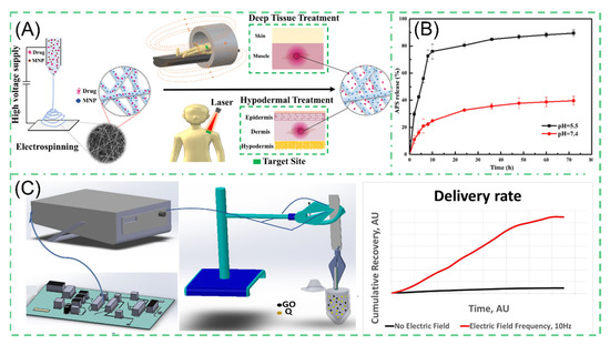 Characteristics, such as site-specific rather than systemic action, controlled drug release and intelligent responsive release, need to be satisfied for effective drug delivery systems [123,124,125]. The advantages of NNHs are evident in blending functionalized nanoparticles within electrospun fibers, which can facilitate the combination of material benefits to achieve the desired properties [126]. Liu et al. developed a fiber surface growth particle morphology fiber through secondary growth of an MOF material by adjusting different concentrations of ligands (2-MIM) and the reaction time. The number of fiber surface particles (ZIF-8) grown produced differences in drug release analysis. When the concentration of ligands (2-MIM) is increased, the more ZIF-8 particles grow on the fiber, leading to a decrease in the amount of drugs released. The presence of nanoparticles significantly reduced the drug release capacity. After 72 h of dissolution experiments, 89% of APS was released at pH = 5.5, and only 40% of APS was released at pH = 7.2. The relative extremely slow rate obviously depends on the pH value (Figure 8B) [127]. Croitor et al. prepared NNHs by a single-step blending process of 10% PLA with different masses of GO stirred well and by ESP [120]. The surface of the fiber is flat and smooth, and the diameter of fiber decreases significantly after loading GO nanoparticles. GO has superior electrochemical properties and can respond rapidly under external electric field stimulation. Through an in vitro drug dissolution test, the drug release capacity at 10HZ PLA/GO/Q is about 8000 times more than that without external stimulation (Figure 8C). In the treatment process, the ability to achieve an intelligent response to the characteristics of drug release through the modulation of electrical signals alone is undoubtedly a groundbreaking innovation. However, in the drug delivery process, it is necessary to provide the appropriate release rate. Too fast a release of drugs can easily reach the peak, biological activity can become to high or a certain degree of toxicity can even be produced. How to precisely regulate the ability to release drugs through changes in electrical signals is still a challenge [128].