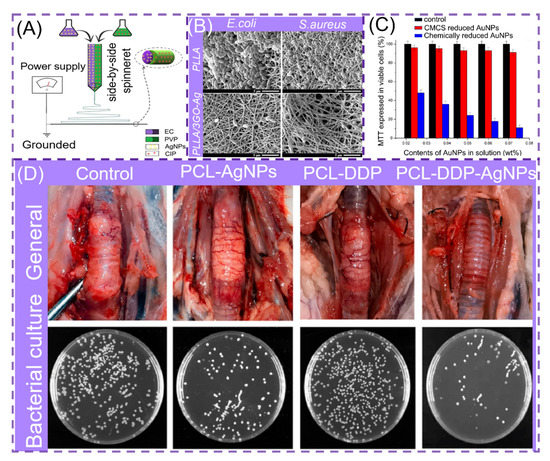 Recently, with the abuse of antibiotics, different types of drug-resistant bacteria emerged [39,132,133,134], and the combination of different types of materials based on NNHs can also generate excellent antibacterial ability against drug-resistant bacteria (Table 2). The preparation of NNHs by loading the bactericidal nanoparticles in the precursor solution begins with the mixed uniform solution, which is prepared into fibers by ESP. Mainstream bactericidal nanoparticles mainly include metal (AuNPs [135,136], AgNPs [137,138]) and metal oxides (ZnO [139], CuO [140] and TiO2 [141]), etc. The accumulation of AgNPs in mitochondria leads to mitochondrial dysfunction. Additionally, AgNPs disrupt the DNA structure, resulting in non-replication and effectively suppressing bacterial multiplication. These two fundamental factors lead AgNPs to possess potent bactericidal potential [142]. Li et al. manufactured PCL nanofibers loaded with AgNPs and cisplatin (DDP), which can be used to prevent airway inflammation and resist granulation tissue proliferation. In comparison with the control group, the PCL-DDP-AgNPs scaffold showed no adhesion to rabbit peritracheal tissues, as shown in Figure 9D, while the coated plate had a superior antibacterial effect [137]. Yang and co-workers prepared Janus nanofibers PVP-CIP/EC-AgNPs by loading AgNPs on the EC side through bide-by-side electrospinning (Figure 9A). The Janus fibers from the disc-diffusion experiment showed a larger circle of inhibition against S. aureus and E. coli than fibers loaded with a single antimicrobial agent, which may be due to the simultaneous action of AgNPs and CIP, steadily increasing the antimicrobial capacity [132]. AgNPs are easily aggregated in polymer fibers, which affects the mechanical properties of the fibers and significantly compromises the antibacterial effect. Bakhsheshi-Rad et al. doped GO/AgNPs into PLLA fibers. They deposited composite fibers onto a bio-implant Mg alloy. SEM images of composite fibers co-cultured with bacteria revealed considerable bacterial cell membrane disruption (Figure 9B). When compared to PLLA nanofibers, GO/AgNPs/PLLA efficiently inhibits bacterial proliferation [133]. This strategy provides new ideas for surface modification of metallic biomaterials, but high concentrations of AgNPs possess a degree of toxicity to normal cells. There is no presence of Ag elements in the organism. For example, if they are mostly deposited inside the liver, they will cause irreversible damage to the organism. Therefore, how to effectively and precisely control the amount of AgNPs released deserves researchers’ deep thinking [143]. There is a similar situation for AuNPs. Ibrahim et al. employed carboxymethyl chitosan (CMCS) as a green reducing agent for AuNPs. AuNPs were encased in PVA nanofibers. This technique reduces the cytotoxicity of AuNPs generated by the chemical reductant method while efficiently preventing bacterial growth. It signifies that safety has been improved further (Figure 9C) [135].
