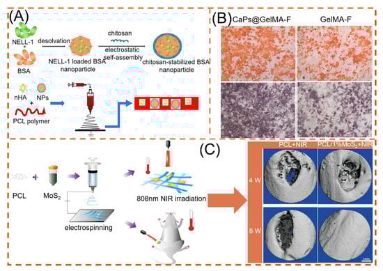 Nanohydroxyapatite (nHA) enhances the osseointegration and osteoconductive properties of hard tissues by embedding itself in the collagen matrix of hard tissues. Song and co-workers spun NELL-1 functionalized chitosan nanoparticles (NNPs) and nHA in PCL fibers (Figure 10A). By incorporating the NPs into PCL electrospun fibers, the authors clearly increased the fiber diameter and demonstrated that nHA and NNPs enhanced cell adhesion sites. nHA presence compared to unmodified nanofibers MC3T3-E1 cell proliferation and differentiation were enhanced [159]. Liu and colleagues prepared hydrogel fibrous scaffolds containing gelatin-methacryloyl (GelMA) and calcium phosphate nano-particles (CaPs). After 14 days of incubation in SBF, significant mineralized nodules developed on the surface of CaPs@GelMA-F. Faster Ca2+ deposition in the early stage can significantly boost the development of calcified nodules later on (Figure 10B). Moreover, bone defects are accompanied by rupture of blood vessels. CaPs@GelMA-F cells were co-cultured with HUVECs cells, resulting in pictures of dense vascular network topology. CaPs@GelMA-F is also very effective in promoting angiogenesis [160].