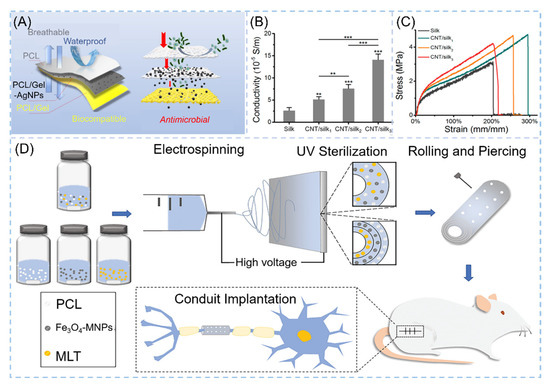 In addition to the various applications in osteogenic tissues, NNHs also have a positive role for other tissue engineering formation. Neural tissue engineering (NTE) is an emerging field. Material preparation requires excellent biocompatibility, certain mechanical properties and good permeability to oxygen and nutrients, etc. [163]. Chen and co-workers demonstrated the combination of melatonin MLT and Fe3O4-MNP with PCL to prepare an outer-middle-internal triple-layer structural scaffold of PCL, Fe3O4-MNPs/PC and MLT/PCL, with MLT effectively reducing oxidative loss. The results revealed that the scaffold had a medullary axon diameter (3.30 μm) similar to the autograft group, which significantly promoted neuronal axon growth (Figure 11D) [164]. Myocardial infarction is one of the more common diseases in humans. Myocardial cells are gradually replaced by scar tissue after necrosis, leading to heart failure and arrhythmias caused by changes in electrophysiological properties, so it is most important for cardiac tissue engineering to have excellent elasticity, high electrical conductivity and promote the growth of myocardial cells [165]. Zhao et al. employed the ES process to create carbon nanotube/silk protein (CNT/silk) scaffolds. The majority of carbon nanotubes are contained within the fibers and dispersed along the fiber development direction. Compared to monospun silk protein, the elongation at the break of the composite fiber is up to 200% or more, and the tensile strength reaches 5.0 Mpa (Figure 11C). The CNT/silk stent’s excellent electrical conductivity implies that it is efficient in avoiding arrhythmia (Figure 11B) [166].
