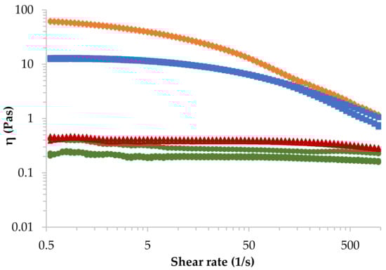 - Matsumoto, T.; Kawai, M.; Masuda, T. Influence of Concentration and Mannuronate/Gluronate Ratio on Steady Flow Properties of Alginate Aqueous Systems. Biorheology 1992, 29, 411–417. [Google Scholar] [CrossRef] [PubMed]