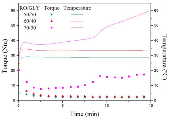 Torque and temperature values for different RO/Gly systems during the mixing stage.