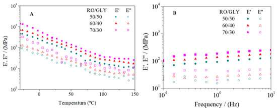 Evolution of viscoelastic moduli with temperature (A) and frequency (B) for bioplastics with different RO/GLY ratio (50/50, 60/40, 70/30).