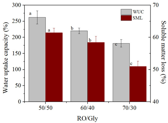 Water uptake capacity and soluble matter loss for the RO/Gly systems: 50/50, 60/40 and 70/30. Different letters (a, b, c) within the same column parameter (WUC or SML) indicate significant differences (p < 0.05).