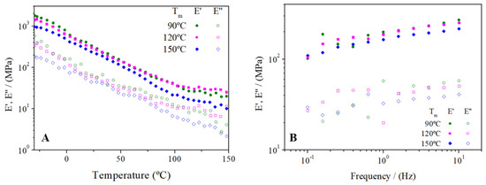 Figure 8 shows the dependence of viscoelastic moduli on temperature (A) and frequency (B) for 70/30 bioplastics molded at different temperatures (90, 120, 150 °C).