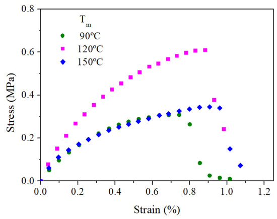 Figure 9 and Table 3 show the stress–strain curves and the main mechanical parameters, respectively, (E, σmax, εmax) for bioplastics with a RO/GLY ratio of 70/30 processed at different molding temperature (90, 120 and 150 °C). The stress–strain curves of the three systems are similar in shape, with an initial linear elastic behavior, the slope of which decayed slightly until reaching the maximum stress when the material ruptured. Greater stresses are required to deform the sample processed at 120 °C when compared to the rest of mold temperatures, which can resist stresses up to 0.7 MPa; twice the value of that can be applied to the rest of the samples. The initial increase from 90 to 120 °C should be related to a certain strengthening of the sample due to thermally induced interactions (e.g., disulfide bonds), while the decrease in the stress–strain curve from 120 to 150 °C should be associated with the previously commented degradation that negatively affects the mechanical properties [23].
