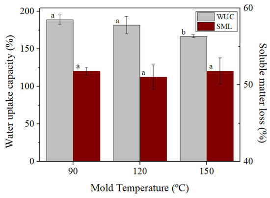 No significant differences were observed in the SML values of the systems with Tm, as all values were around 51.5%, which implies that molding temperature does not exert much influence on soluble matter loss. Different letters within the same column parameter (WUC or SML) indicate significant differences (p < 0.05).