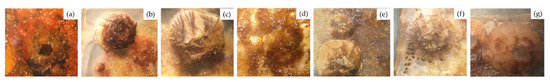 Digital microscope images of marine biofouling on various material surface in seawater (a) carbon steel; (b) neat PDMS; (c) PDMS with 1 wt.% SiO2; (d) PDMS with 3 wt.% SiO2; (e) PDMS with 5 wt.% SiO2; (f) PDMS with 7 wt.% SiO2 and (g) PDMS with 10 wt.% SiO2.