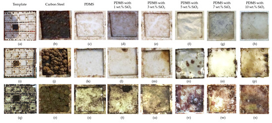 Marine biofouling on various sample surfaces after immersed in seawater environment (in April-June) (a–h) immersed for 2 weeks; (i–p) immersed for 4 weeks and (q–x) immersed for 8 weeks.