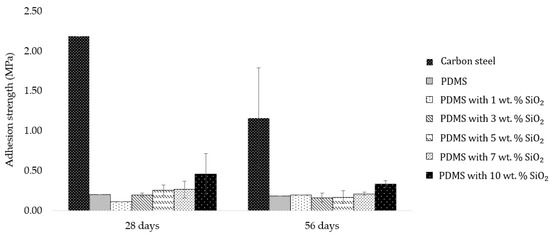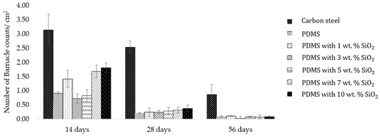 Neat PDMS and PDMS/SiO2 composite films were further examined in a short-term marine field test at Koh Sichang Marine Science Research Centre of Chulalongkorn University (13°09′10.6″ N 100°49′02.6″ E) in Thailand from April to June to study antifouling performance of the composite films by determining the number of barnacles and barnacle adhesion strength on the surfaces. The number of barnacles of each sample was compared with carbon steel (JIS SS400) as a reference material, using a digital microscope (Figure 3). After 2 weeks, the blank control carbon steel was fully covered by fouling organisms, including barnacles. on the surface (Figure 4). Moreover, corrosion and rusting were also observed on the surface of the carbon steel. Barnacles on the surface of carbon steel presented at approximately 3.1 ± 0.6 marine barnacles/cm2. After 4 and 8 weeks, this decreased from 2.5 ± 0.2 to 0.9 ± 0.4 marine barnacles/cm2, which was due to the increase in the size of barnacles. However, the number of barnacles of the neat PDMS in sea water after 2 weeks was approximately 0.9 ± 0.1 marine barnacles/cm2 for the samples facing away from the shore (Figure 5). When immersed longer, some biofoulings disappeared from the surface of the neat polydimethylsiloxane, since fouling was more easily released from the surface of the neat PDMS samples due to weak adhesion between the surfaces [38]. Furthermore, PDMS with 3 wt.% SiO2 exhibited slightly less barnacles than the blank control carbon steel and the neat PDMS samples. The marine organism counts decreased by 77% at 2 weeks and 97% at 8 weeks, when compared to the reference carbon steel.