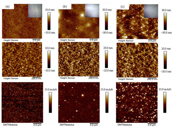 To support WCA results, surface roughness of neat PDMS, PDMS with 3 wt.% SiO2 and PDMS with 5 wt.% SiO2 composite films were studied by means of an atomic force microscope (AFM). Surface roughness is a key factor to increase water contact angle of a surface because the surface architecture of hierarchically rough surfaces reduces available contact area and the ability for water droplets to adhere to the surface [41]. The surface roughness of the PDMS film could be further improved by introducing SiO2 particles and the material could become more hydrophobic after the addition of SiO2 particles in the PDMS matrix. AFM was employed to collect topography images and measure roughness of the scanned samples by showing a brighter phase and a darker phase, with the brighter phase showing a higher modulus than the darker phase [42]. The AFM topography images of the PDMS with SiO2 composite film presents the dark areas as PDMS and the bright areas as SiO2 (Figure 8). The neat PDMS, PDMS/SiO2 composite with 3 and 5 wt.% SiO2 exhibited surface roughness in increasing order at nanoscale polymeric structures, according to the AFM results. Figure 8 illustrates the AFM result, which indicates a roughness value of less than 10 nm for the neat PDMS and the surface roughness of the film increased by adding SiO2 particles. Moreover, the relative modulus of the polymeric film was also improved when 3 wt.% SiO2, and 5 wt.% of SiO2 was added to the PDMS matrix.
