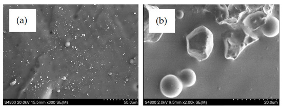 From the results of PDMS with SiO2 composites in the previous section, the optimum wt.% of SiO2 for improving the mechanical properties of PDMS was 3 wt.% of SiO2, so this was employed to further improve the PDMS/PU (95:5) blend film. It gave the lowest number of barnacle attachments, low bonding strength of barnacles and high contact angle of the film after fabricating with micropatterning, using the soft lithography process from previous work [10]. The main objective of using SiO2 particles in a low viscous liquid polymer blend was ease of the process by improving surface wettability and surface strength. The surface morphology of the PDMS/PU (95:5) with SiO2 composite was observed with field-emission scanning electron microscopy (FESEM). The PDMS/PU (95:5) film without SiO2 filler clearly illustrated homogenous distribution of PU in PDMS phase, in which the average diameter of dispersed polyurethane particles was about 8.3 ± 5.6 µm. Nonetheless, PDMS/PU (95:5) with SiO2 composite showed that silica particles caused decrease in size of PU droplet diameter and resulted in a finer dispersion of PU in the PDMS matrix to around 2.7 ± 1.7 µm (see Figure 9). It was confirmed that the addition of SiO2 filler modified and improved PU compatibility with the hydrophobic PDMS matrix [32].