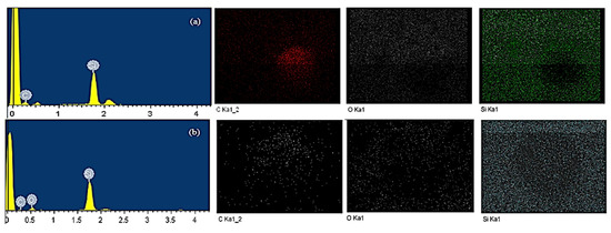 Energy-dispersive X-ray spectroscopy (EDX) mapping spectrum of PDMS/PU (95:5) with SiO2 composite indicated the characteristic elemental distribution (C, O and Si) (see Figure 10). It was observed that the oxygen (O) weight percentage in the PDMS/PU with SiO2 composite increased from 14.24 wt.% to 31.68 wt.% and weight percentage of carbon atoms decreased from 53.47 wt.% to 32.27 wt.% with the addition of SiO2 into the PDMS/PU (95:5) blend. It was also illustrated that when SiO2 was added to the PDMS/PU blend, the silicon (Si) weight percentage of the surface increased from 32.29 wt.% to 36.05 wt.%, as shown in Table 2.