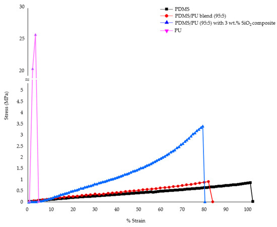 Stress–strain curves of neat PDMS film; PU film; PDMS/PU blend (95:5) film; PDMS/PU (95:5) with 3 wt.% SiO2 composite film.
