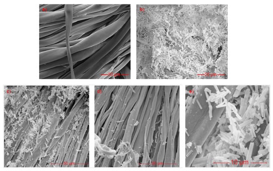 At the usual synthesis temperatures of HKUST-1, the most common morphology found is octahedral, while lower temperatures lead to the shape of cubes with sharp edges. However, the morphology of HKUST-1 that was found showed the shape of a nanorod, as shown in Figure 1c. According to Yang and coworkers, variations in the concentration of organic ligands can easily change the morphology of a MOF []. Moreover, according to them, the morphology of nanorods presents an excellent surface area and crystallinity. It is worth mentioning that, combined with the concentrations of organic ligands at a synthesis temperature lower than the usual ones and with the longer reaction time, this may justify the increase in the crystallinity of the morphology found. Tehrani et al. [] and Martínez et al. [] report synthesis processes for MOF, in which the formation of HKUST-1 nanorods occurred. These same authors describe the similarity between zinc and copper MOFs, which reinforces the results found by Yang et al. [] It is also likely that the interaction between MOF/reagents and cotton cellulose leads to an unusual shape of the MOFs.