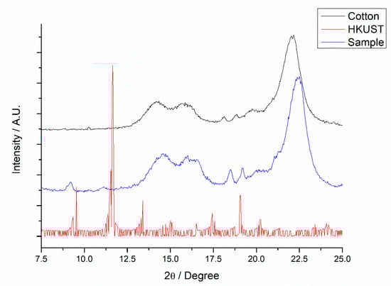 Cotton is the second most consumed textile fiber in the world, behind only polyester [,]. Its good breathability and absorption capacity make it a promising site for the proliferation of microorganisms []. The growth of these beings can cause a degradation of the substrate, and even cause possible contamination [,]. Therefore, this work seeks the direct synthesis of HKUST-1 in cotton fabrics, analyzing how it influences the properties of the textile material.
