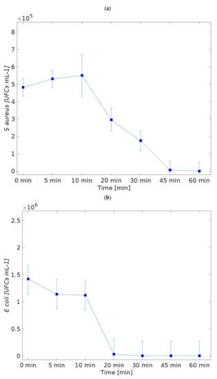 Killing-time curves of (a,b), the sample functionalized with HKUST-1 against S. aureus and E. coli bacteria, for up to 60 min of culture. Data derived from two repetitions (means S.D.) according to standards. Positive controls for each bacterium (growth without agent) were also conducted, reaching maximum values of 4.23 × 105 and 2.1 × 105 CFUs mL−1 for S. aureus bacteria agent-free solution and values of 0.98 × 106 and 1.24 × 106 CFUs mL−1 for E. coli bacteria agent-free solution, after 1 h (data not shown in graphic).