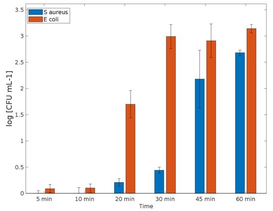 The functionalized samples were capable of presenting an antimicrobial activity in comparison with the control, as expected. Their action begins after 10 min of contact with each bacterium. Data reported an elimination greater than 99.9% for E. coli (3.14 log reduction) and bactericidal activity (greater than 3 log10 fold decrease in colony forming units). For S. aureus, elimination was greater than 99% (2.68 log reduction) after 1 h for the samples treated (Figure 4). Probably, an additional time of the kinect test would present a bactericidal activity as well, once the kinetics demonstrated a greater action after 45 min of contact.