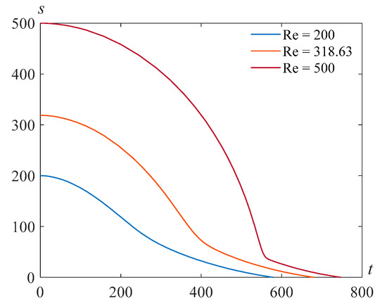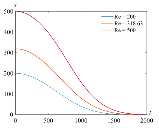 Figure 9 and Figure 10 demonstrate solutions s(t) of problem (24), (25) for , and various values of the Reynolds numbers and the parameter .