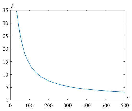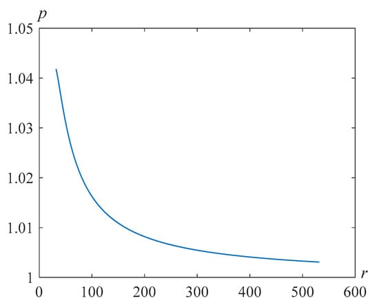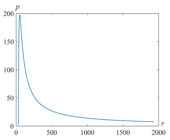 respectively. Figure 11, Figure 12 and Figure 13 illustrate the distributions of pressure in the liquid surrounding the bubble in the Pavlovskii and the second-grade fluid models at the time moment, when the bubble radius is less than the initial one by approximately 10 times for and the various values of the parameter .