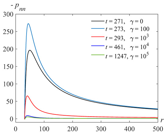The more important characteristic is the normal stress. Figure 15 shows the normal stress in the fluid surrounding the bubble for , and the various values of the parameter and at different points in time. Here, we observe a non-monotonic character in the distribution of normal stresses depending on the parameter proportional to the relaxation viscosity coefficient.