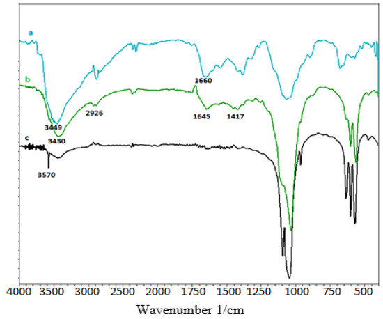 FT-IR of, (a): chitosan; (b): HAp/CTs; and (c): HAp.