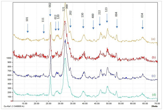 Figure 2 illustrates the XRD spectra of the four composites. Before XRD analysis, the composites were calcinated at 900 °C. All spectra show two intense peaks around 26° and 31.8°, which represent the crystalline regions (002) and (211), respectively.