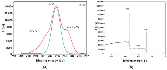 The composite particles in the current investigation were created utilizing two distinct ways. First, the surface composition of the three samples was investigated using X-ray photoelectron spectroscopy (XPS). The binding energy of N1S is reflected by a prominent peak at 399.3 eV in the XPS spectra of all samples shown in Figure 6. The nitrogen signal, which only originates from chitosan’s amino groups, demonstrates the presence of chitosan in the biocomposites surface layer and implies that chitosan molecules are genuinely interlocked, making true nanocomposites. At 287.8, 286.4 and 284.9 eV, the C1 Speak is divided into three pieces. The peaks represent the O-C-O, C-OH and C-C bonds found in chitosan (Figure 6a). At 532.8 eV, a third peak appears, which corresponds to the O1 ascribed to the hydroxyl groups (Figure 6b).