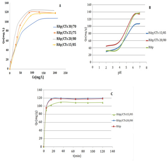 The kinetic parameters for Cd2+ ion adsorption onto HAp/CTs composites were determined by fitting the pseudo-first-order model (Equation (7)), the pseudo-second-order model (Equation (8)) and intra-particle diffusion (Equation (9)) to the experimental data.