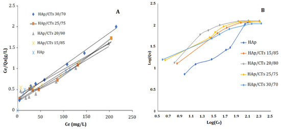 (A) Langmuir; and (B) Freundlich adsorption models for Cd2+ on HAp/CTs composites.