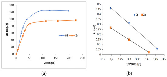 where Kc is a thermodynamic constant, Cads is the equilibrium Cd2+ adsorbed quantity (mg/L), Ce is the equilibrium concentration (mg/L), T is the solution temperature (K) and R is the ideal gas constant (J/mol·K) [36].